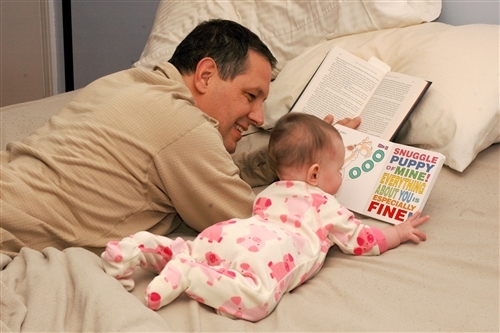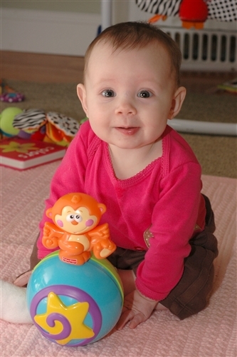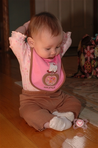 You used to have a temper. I remember you as young as 2 months old, held in an upright position as you reached for your toy. You would growl and growl as you tried to force your hands into behaving until finally you could take the frustration no longer and you burst into wails and unhappy screeches. You used to sleep peacefully in the sling but upon awakening would arch your back and scream to be let out immediately. I’m amazed at how much more patient you are now, laying on the floor playing with your toys. I just sit back and watch you most of the time, letting you struggle to pick up your book, even though it’s so big and awkward in your hands. You roll back and forth, tugging at the toy this way and that, trying to figure out why it’s stuck under your arm, or why when you pull one side of a blanket the other side moves, too. I can see the concentration on your face.