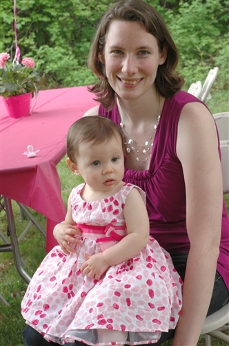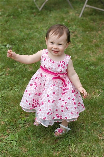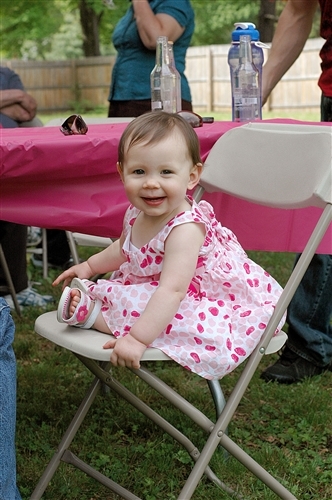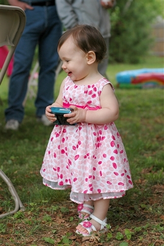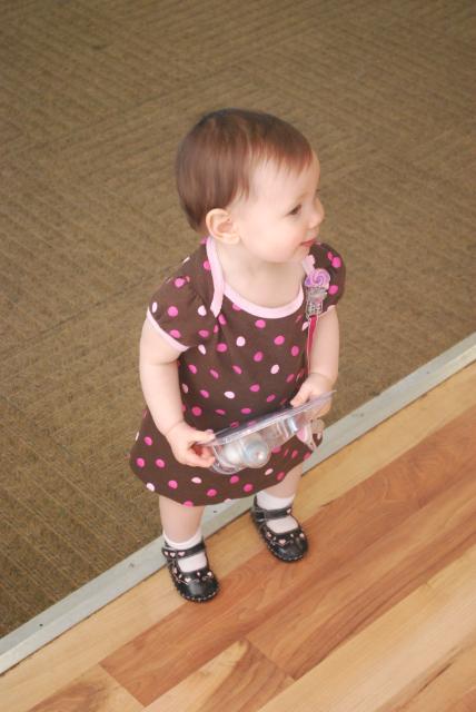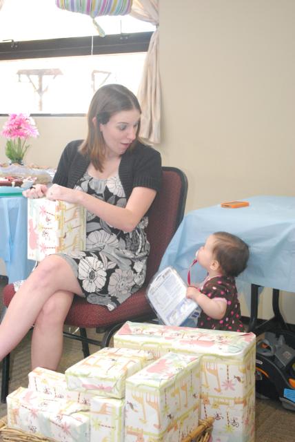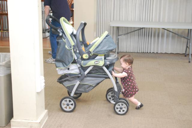 I had brunch in the morning before the shower so I arranged to meet Den at the shower, he would get Kate ready and bring her. He had a baseball game to go to, so Kate got to spend the day at the shower with me. I was very very relieved to arrive and find a very cute little munchkin in a dress, freshly bathed and well-rested from a morning nap. Go Denis for pulling that off! Kate did fantastic. We got there at 1pm to set up, I brought her push-walker to amuse herself while I was busy. It was a very large space with closed doors leading out so I felt safe letting her wander. The party started at 2 and she had fun walking around flirting with people. But her thing right now is pushing things. My living room is constantly getting rearranged as she moves the chairs all over the place, along with her walker and table toys. Bringing her walker with me was a very good idea, however you know what’s better than a walker? A stroller! Thankfully Carrie’s mother very thoughtfully brought the brand new travel system that was her shower gift and left it all set up, just sitting there, begging to be pushed. And Kate zoned right in on it. So I figure Kate spent about 2 hours pushing that stroller around the room. Hilarious for many reasons, not the least of which being that Kate is a very short child at about 28 inches tall. It made keeping track of her very easy though. I’d be taking pictures of the gift opening and I’d look around the room. If I didn’t see my child I would look for the large object that was seemingly moving by itself. Everyone thought she was so cute.